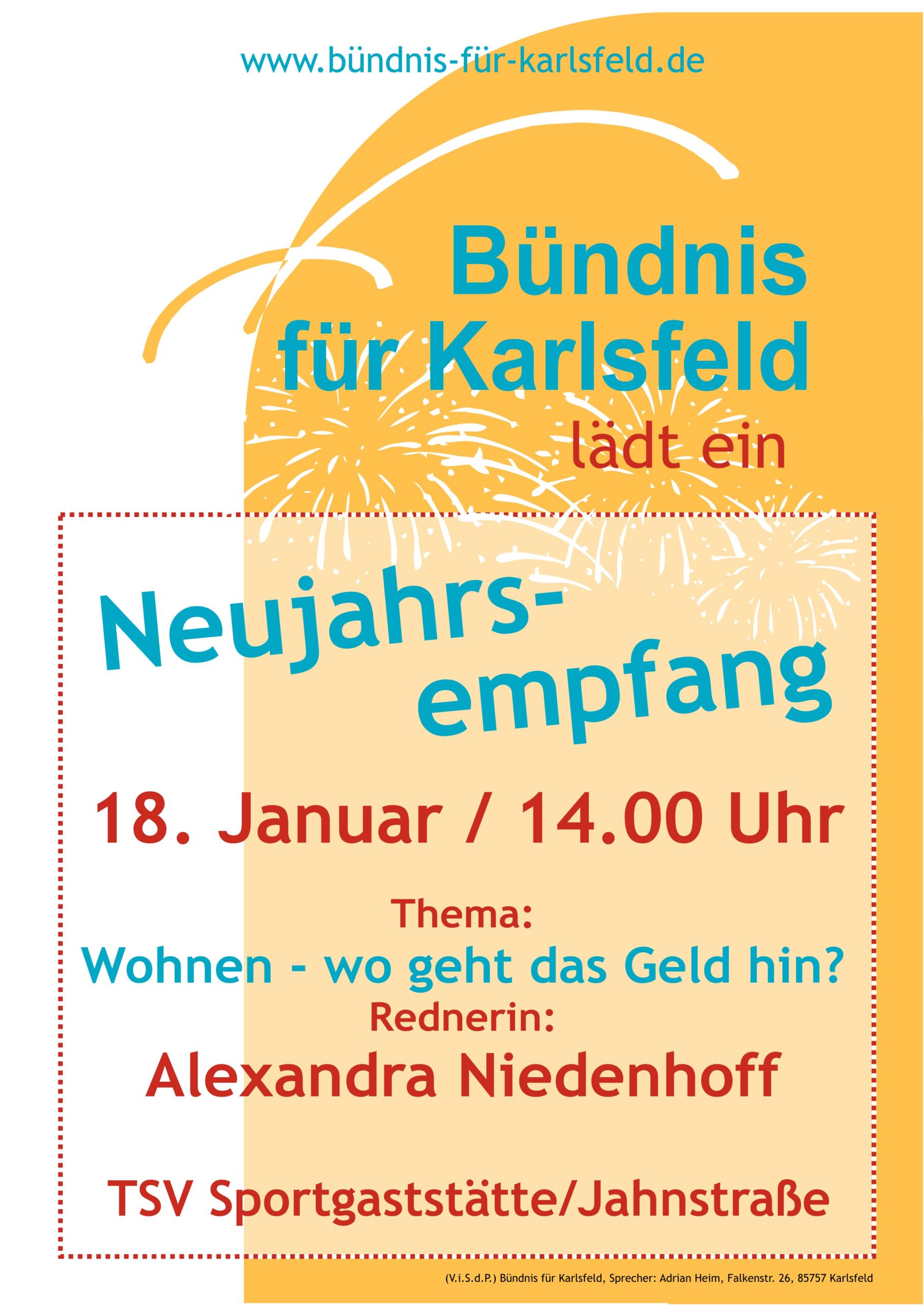 Das Bündnis für Karlsfeld lädt zum Auftakt des Wahljahres am Sonntag, dem 18. Januar zu einem Neujahrsempfang ein. Beginn ist ab 14 Uhr in der TSV Sportgaststätte in der Karlsfelder Jahnstraße.