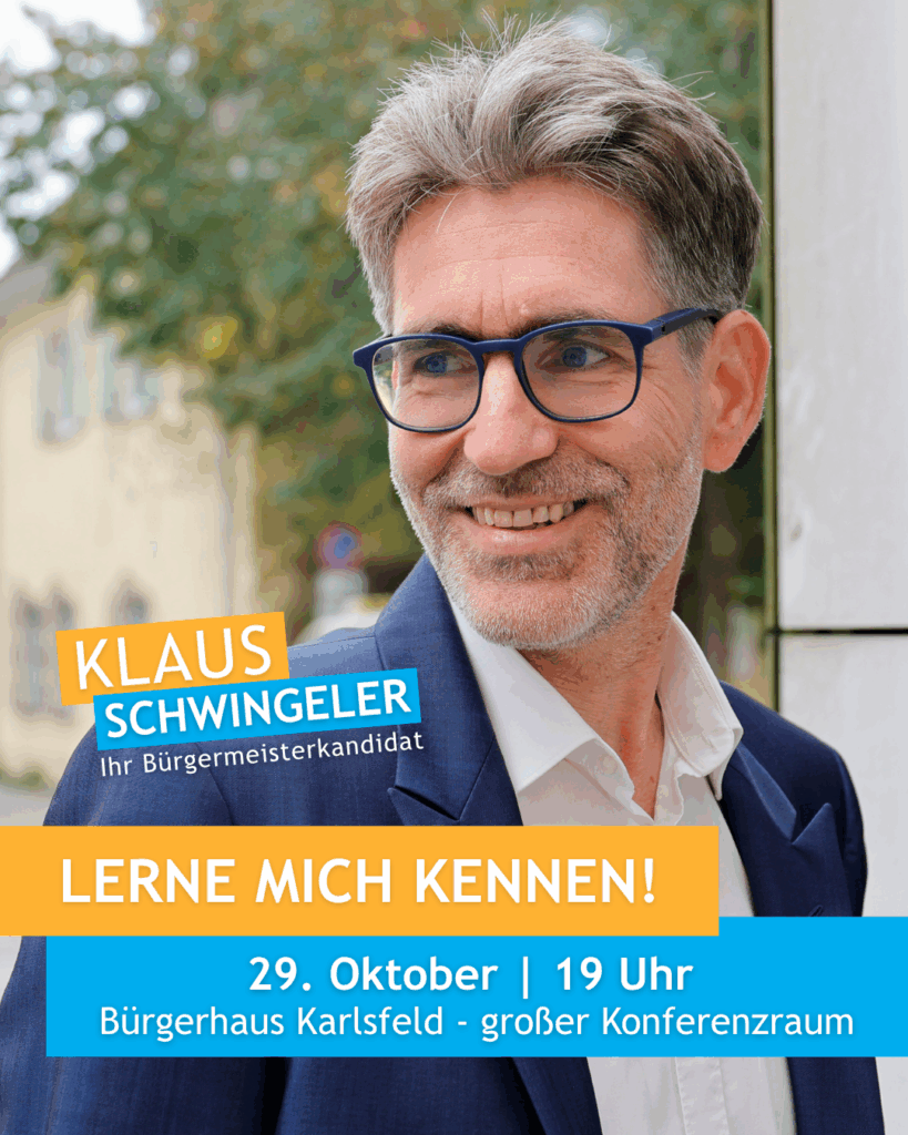Wollen Sie unseren Bürgermeisterkandidaten Klaus Schwingeler kennenlernen? Dann kommen Sie am 29. Oktober ins Karlsfelder Bürgerhaus. Ab 19 Uhr stellt sich Klaus Schwingeler vor und geht gerne auf Ihre Fragen ein.
